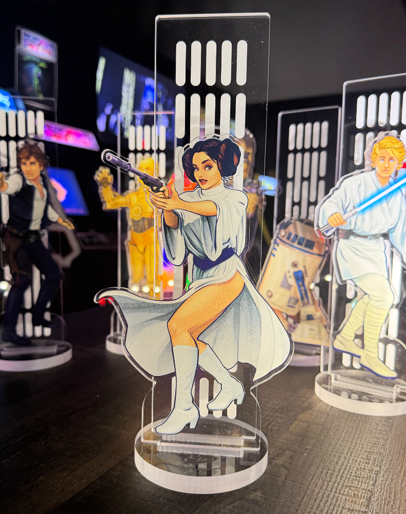 These rebellious space-fighting standees are printed on 1/4" thick custom die cut acrylic that stand approximately 06" W x 10" H and are accompanied with  a personalized name plate and round 1/2" thick acrylic base. All are hand signed by Ant Lucia!
